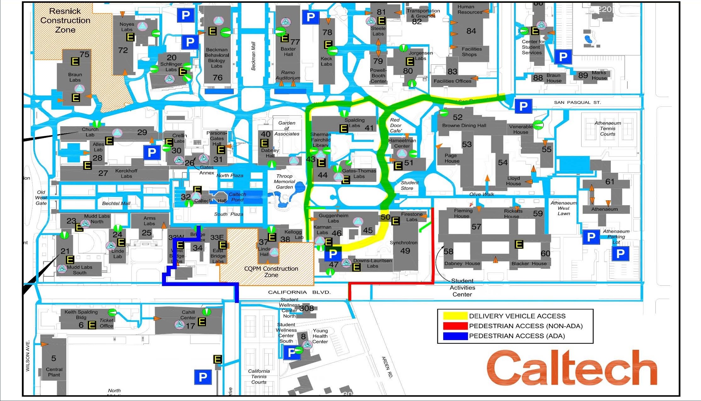 For those traveling across California Boulevard, the crosswalk at S. Campus Drive (near the Cahill Center for Astronomy and Astrophysics) and California Boulevard will provide access to the west side of campus, while the crosswalk at Arden Road and California Boulevard will provide access to the east side of campus.